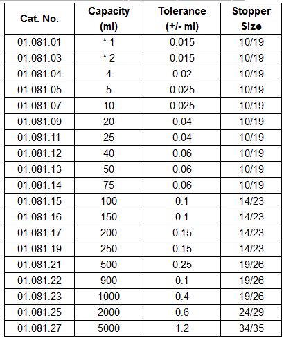 Flask Volumetric RELIGLAS with interchangeable stopper, accuracy as per Class A of ISO 1042/ IS 915 : 2012, with calibration certificate. (1 ml. and 2 ml. Volumetric Flasks are of Test Tube shape & 5, 10 & 20ml Volumetric Flasks supplied in Trapezoidal shape.)