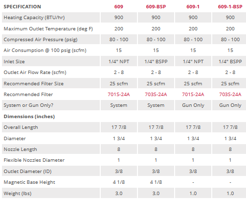 Hot Air Guns are used where milder heat is needed as compared to an electric heat gun. It is ideal for pre-heating of parts, processes and solutions, with an output flow rate of 2-8 scfm; and is also widely used for softening adhesives, rubber and vinyl, and accelerating drying. The hot air gun requires no electricity at the target, and uses only filtered compressed air to generate fully adjustable temperatures up to 200 deg F.