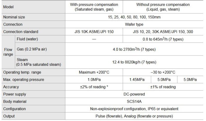 DELTA FLOWPET DX (with pressure compensation) is a piezoelectric DELTA vortex flowmeter combined with a built-in pressure sensor. It measures mass flows of saturated steam and gas with corrected for pressure. Liquid, gas, and stream are measurable for volume flow measurement.