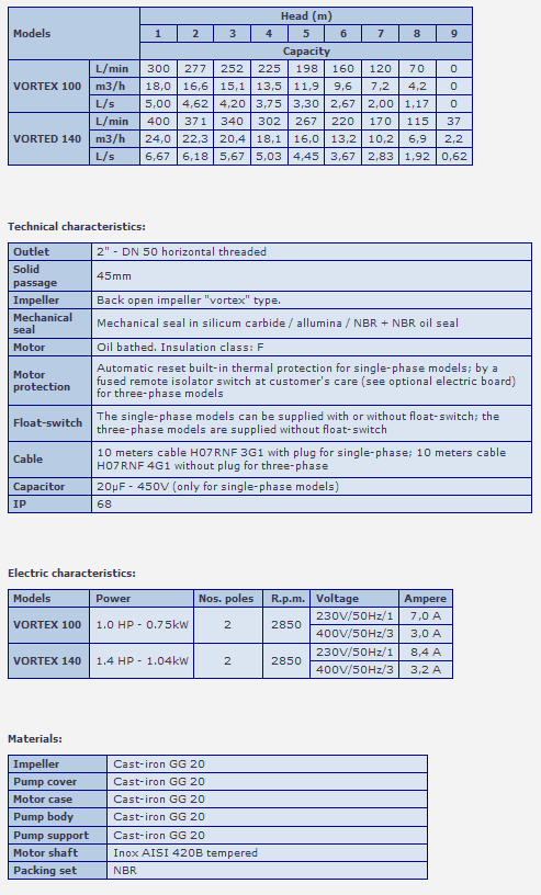 Pump in cast-iron with "vortex" impeller. When the impeller turns, it creates a vortex pushing the water through the pump body. As the impeller is positioned in the upper part of the pump body it permits a wide free passage for the solid parts contained into the water. Thanks to its heavy duty construction and the top quality oil bathed motor the VORTEX 100 can be used also to pump sewage water and manure. In case an electrical problem occurs, the reparation of the pump is extremely easy because the electric connections and the capacitor are positioned under the cover and completely isolated from the motor; so if some water enters into the pump from a cut in the cable the motor will be safe.