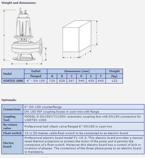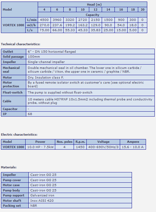 The VORTEX 1000 is usually installed into big block of flats` cellars to drain the dirty water or in public sewage water nets. This model is also often used in farms to pump out the manure of the stables, in industrial plants, in sewage water treatment plants, in sludges treatment plants, etc. This model cannot be used to pump water containing stones.