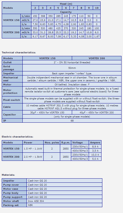 Pump in cast-iron with "vortex" impeller. When the impeller turns, it creates a vortex pushing the water through the pump body. As the impeller is positioned in the upper part of the pump body it permits a wide free passage for the solid parts contained into the water. Thanks to its heavy duty construction, the double indipendent mechanical seals and the top quality oil bathed motor the VORTEX 150 and VORTEX 200 can be used to pump sewage water and manure. In case an electrical problem occurs, the reparation of the pump is extremely easy because the electric connections and the capacitor are positioned under the cover and completely isolated from the motor; so if some water enters into the pump from a cut in the cable the motor will be safe.