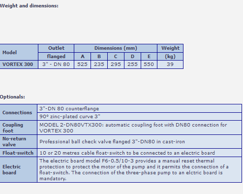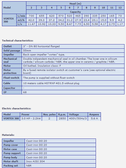 The VORTEX 300 is usually installed into block of flats` cellars to drain the rain water or the domestic sewage water but this model is also often used in farms to pump out the manure of the stables, in industrial plants, in sewage water treatment plants, etc. This model cannot be used to pump water containing stones.