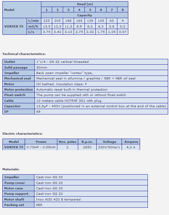 Small pump in cast-iron with `vortex` impeller. When the impeller turns, it creates a vortex pushing the water through the pump body. As the impeller is positioned in the upper part of the pump body it permits a wide free passage for the solid parts contained into the water. Thanks to its heavy duty construction and the top quality oil bathed motor the VORTEX 75 can be used also to pump sewage water and manure. In the model VORTEX 75 the capacitor is always positioned in an external control box to reduce the dimensions of the pump permitting the installation in really small pits.
