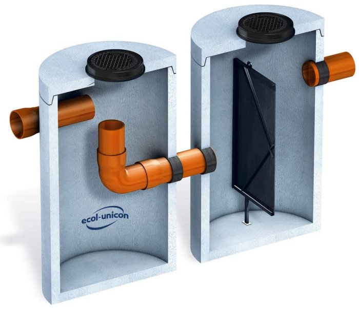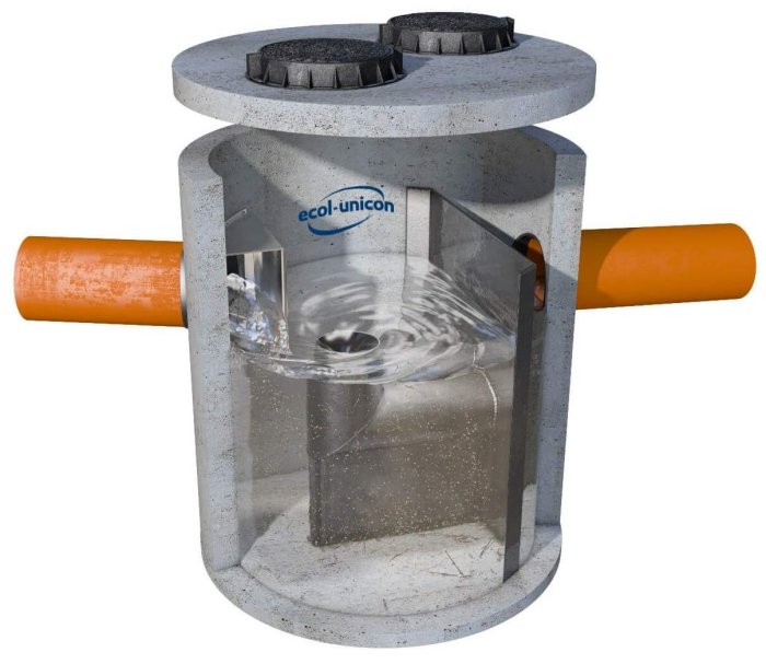 Settling tanks have a watertight concrete chamber of the diameter of EU chambers or are made of DZB modular reinforced concrete retention tanks or can be installed as a separate chamber in a DZB chamber with pre-treatment system. Depending on the location of the device there are different cast iron or cast iron concrete manholes used in A15, B125 and C250 classes. When used in overrun areas (road, car park, maneuver area etc.) heavy manholes class D400 are used.