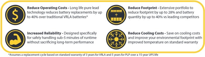 C&D Technologies’ UPS Pure Lead Plus batteries provide the same benefits from the High Rate Max Series plus the added benefits of C&D’s proprietary Pure Lead Plus Technology. Pure Lead Plus batteries provide superior performance and extended life at elevated ambient temperatures when endurance counts to ensure your business systems run uninterrupted.