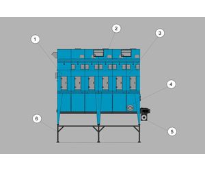 When the desired exhaust capacity is known, we can make an exact energy savings calculation. The dust which appears under the blowing in section and the filter section is collected in a collecting funnel. Under the funnel a screw conveyor is made. By means of the screw conveyor the dust is transported to the end of the filter, which features a rotary valve. The rotary valve transports the dust pressureless to a container The filter is placed on a steel structure, where the height of the floor can be adjusted.