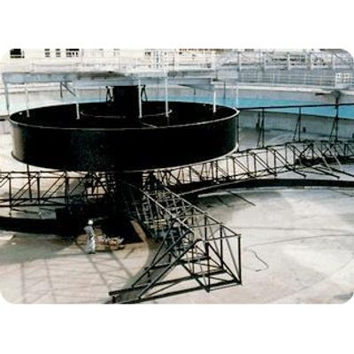 For greater flows and the resultant larger basins, higher torque capacities are required of the collector mechanism. A spur gear driven pier-supported collector is usually best applied in this class of service. Walker Process Type RS collectors are built around a center pier which supports the entire rotating portion of the machine plus half of the access bridge load. In addition to providing support, the pier resists the torque developed by the collector`s sludge plowing action.