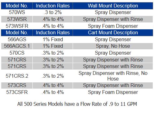 All 500 series MixRites are available in a wall mount spray or cart mount spray & foam system and are designed for water flow to 11 gpm (41 L / min.) and a wide array of chemical and other additives (see 500 Series Pump page). MixRite compressed air foam systems allow any length of hose installed on the outlet of the dispenser. The hose length or foam nozzle have no effect on the foam quality making the MixRite ideal for foaming applications using long runs of hose or pipe.
