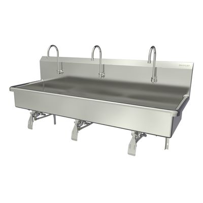 Certified NSF/ANSI Standard 2 Food Equipment and NSF/ANSI 372 low-lead; Constructed from welded #16 gauge type 304 stainless steel. The front, bottom and back are formed from a single sheet with a rolled rim on front and sides. Exposed surfaces have a blended uniform satin finish. Specially designed knee valves provide easy access to working parts without disconnecting mount or plumbing.