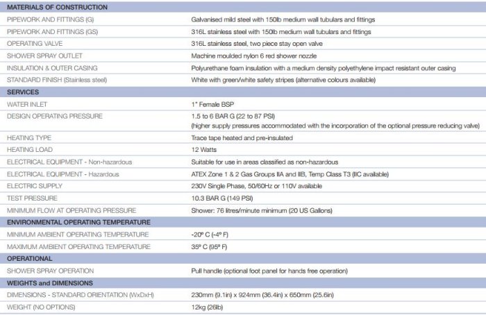 EXP-AH-2GS: Wall-mounted trace tape heated and pre-insulated drench shower with 316L stainless steel pipework. Suitable for hazardous environments, this freeze-protected and insulated emergency safety shower is intended for use where there is a possibility of the water inside the shower freezing due to extreme cold climates. Wall-mounted unit, ideal for use where space is at a premium. Suitable for both hazardous and non-hazardous areas. Fast, easy-grip shower activation with powder coated stainless steel pull rod for corrosion free longevity. Trace-tape heated and polyethylene foam and jacket insulation for improved frost protection and strength. Electrical supply: 230V Single Phase, 50/60Hz (110V optional).