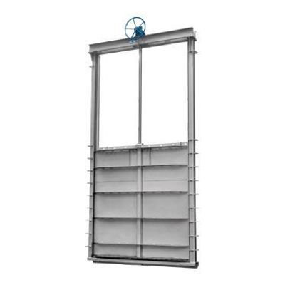 Four-side sealing flush bottom wall mounted penstock. Square or rectangular port sliding wall penstocks sealed on all 4 sides. Used for on-off or control applications in wells, tanks, pipe outlets, etc. Carbon or stainless steel fabricated construction, with tight sealing by means of elastomer seals. Available in a wide range of dimensions and for many different pressure heads.