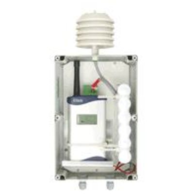 Wall mounting IP65 case with: Stevenson screen. RHT20E RH/T probe. GD43EScf transmitter (with display). Transmitter conformally coated with extended battery pack and inputs for pyranometer (0-30mV) and external temperature sensor.