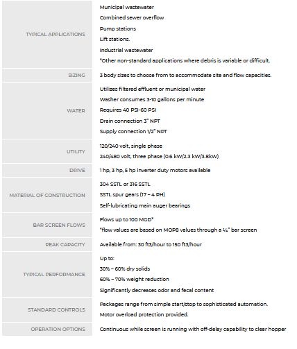 The only washer compactor that matches the capacity of the Duperon  FlexRake. Washer compactors help to automate the solids handling process efficiently and provide a bottom-line impact to meet requirements and reduce landfill volume.