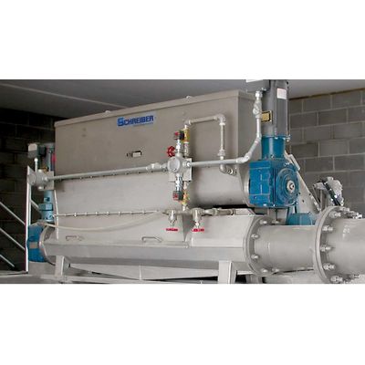 The Schreiber Washer Compactor washes out organics and dewaters screenings in a batch sequence. Screenings enter the top of the unit, and a rotating shaftless screw agitates them under a spray of wash-water. The motion loosens organic substances from the screenings, allowing them to drain back to the process stream. The washed screenings are then transferred over a barrier at one end of the wash trough into a compactor section below. A compactor screw and conical discharge subsequently dewaters the screenings, and convey them through a larger diameter discharge pipe. This significantly reduces the volume and organics of the screenings material, resulting in disposal cost savings.