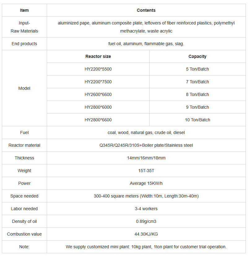 - Input material: aluminized pape, aluminum composite plate, leftovers of fiber reinforced plastics, polymethyl methacrylate, waste acrylic.