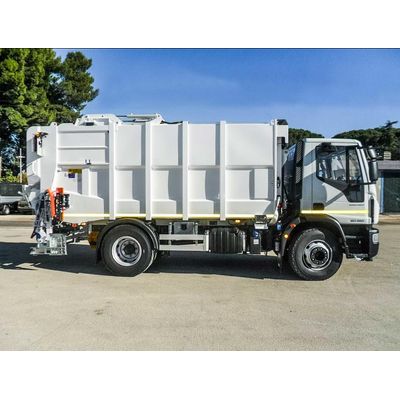 Lifter for waste containers and/or bins. Rear camera with cabin monitor. EC approved rear workers footboards.