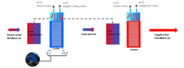 Dehumidification waste-heat exchanger is like dehumidification heat pump. It utilizes refrigeration system to cool and dehumidify hot and wet air. The Cooler plays the role as evaporator of heat pump, while the Heater plays the role as condenser. The Heater provides the supply air with drying thermal, while the Cooler provides the moisture steam with cold source for condensation.