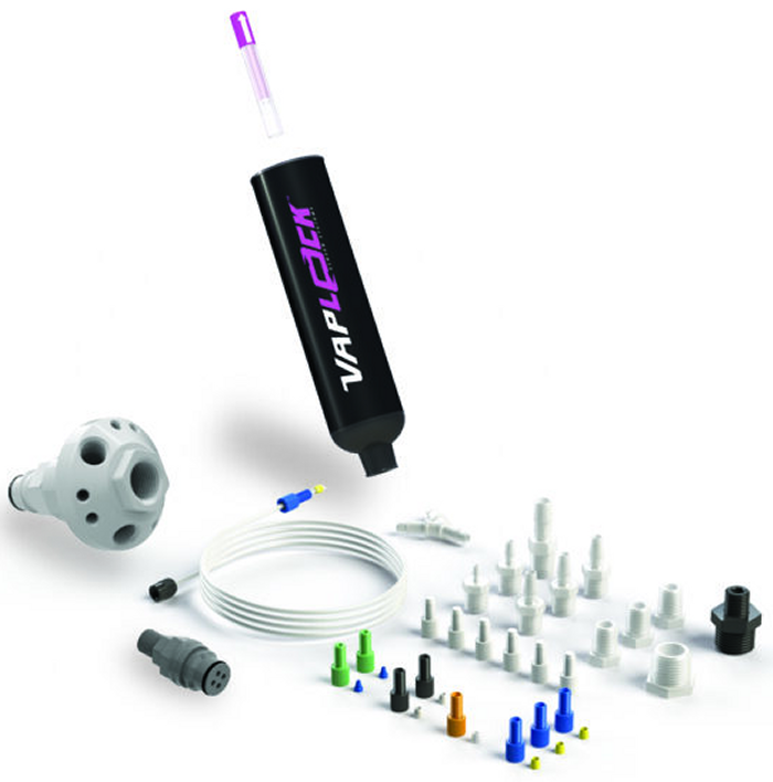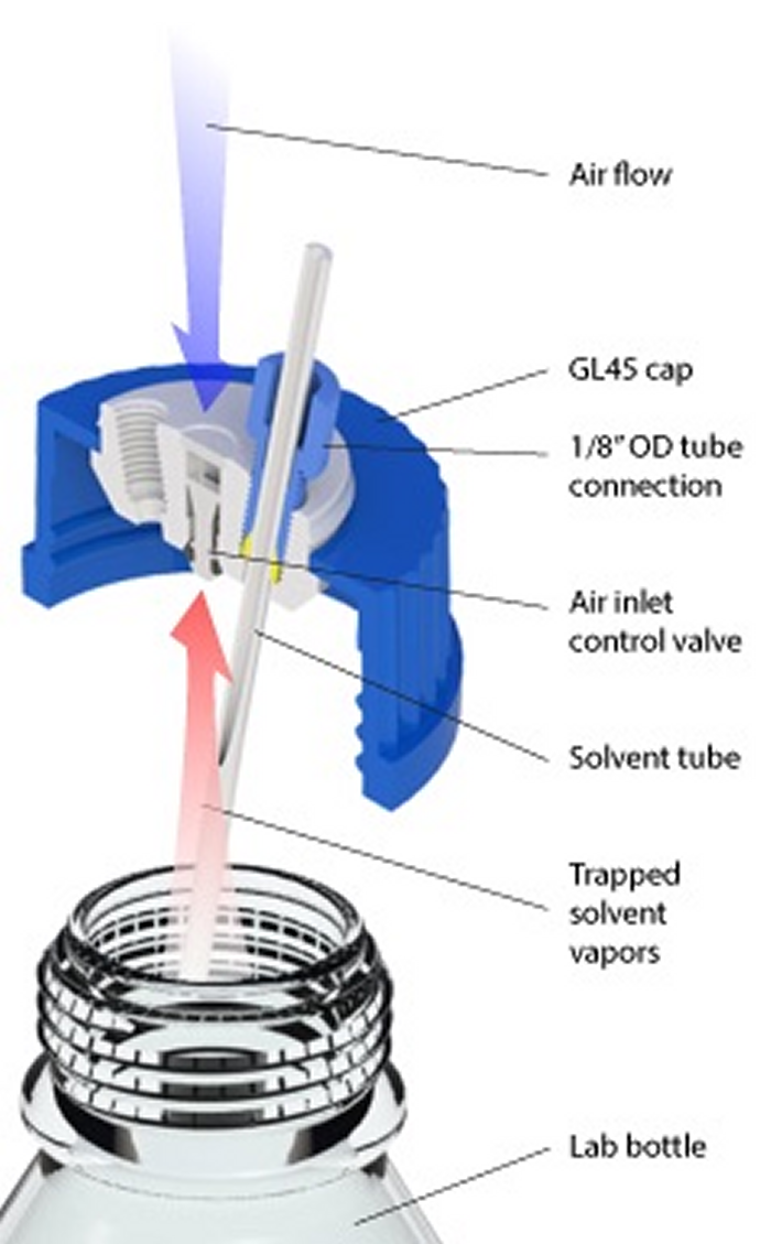 Waste solvent lines from HPLC’s and other analytical instruments should be securely connected to approved waste containers to minimize spills and leaks of solvents and reduce vapor emissions by using Vaplock Waste Containment Kits.