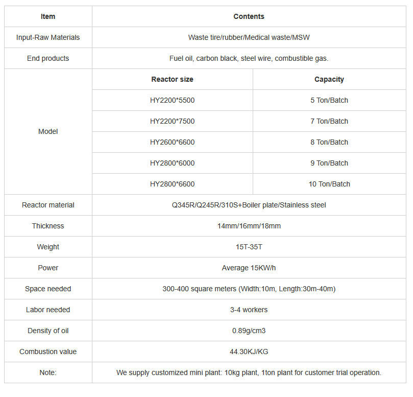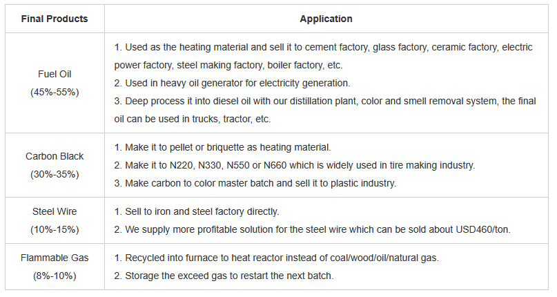 Huayin waste tire recycling project adopts pyrolysis technology that breaks down the larger molecules into smaller molecules in presence of heat. Waste tire recycling project obtains the final products as follows: 45%-55% fuel oil, 10%-15% steel wire, 30%-35% carbon black and 8%-10% flammable gas. It is 100% recycling project, not only a profitable business, but also helpful for improving the local environment, avoid garbage pollution.