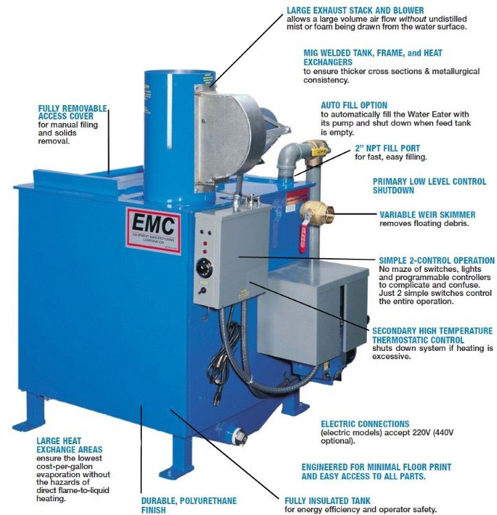 Evaporation is the simplest and most cost effective method for minimizing a wide variety of industrial water-based waste streams. It has been approved by many regulatory agencies around the country as a safe and accepted method for on-site wastewater minimization. EMC®, with the experience gained from over 20 years of manufacturing experience and thousands of systems in the field, is the industry leader in providing high value, reliable, and easy-to-operate wastewater evaporators. All EMC® Water Eaters come with the following standard features.