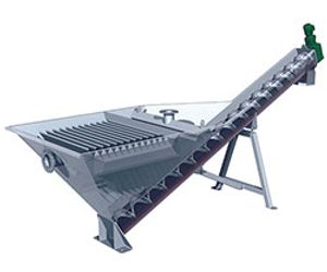 The grit classifier consists of a sloping bottom tank and a screw conveyor. The grit settled at the bottom of the tank is collected, lifted by the screw conveyor and then drained and discharged. The screw diameter and consequently the grit classifier model varies according to the volume of grit to be dewatered.