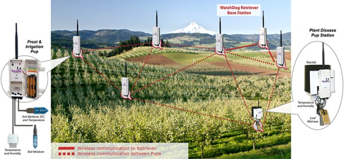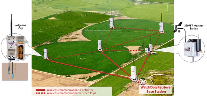 The WatchDog Retriever wirelessly collects sensor data from in-field Pups, which can be custom configured with multiple sensors: weather, soil moisture, or both, to meet site-specific requirements.