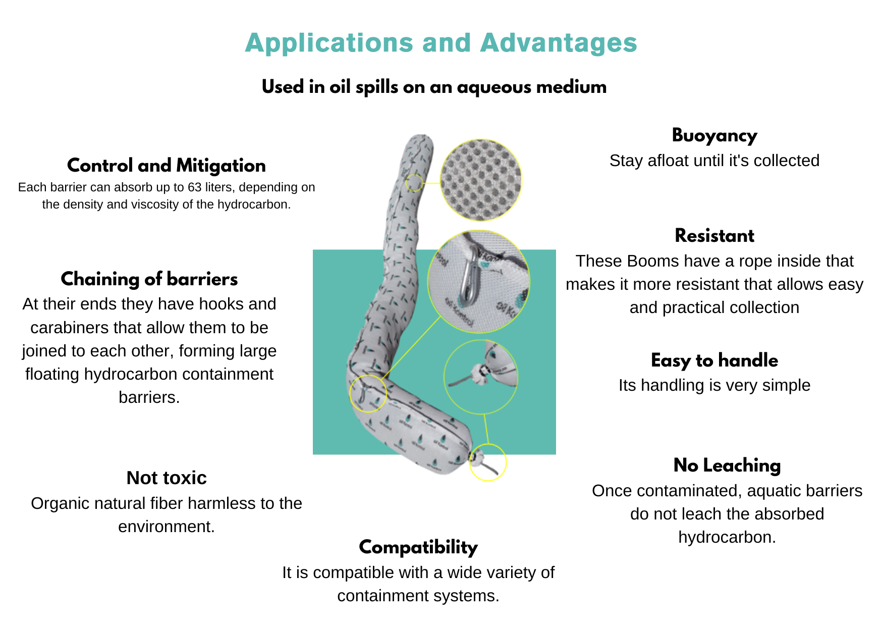 They are 3d polyester sleeves filled with denatured, stabilized and inertized bio-absorbent fibers, designed to be used in oil spills on water, they have carabiners and double rope that allow their union with other barriers for containment and mechanical resistance on water bodies. They have been tested on the high seas, rivers, and on underwater platforms where inclement weather complicates the hydrocarbon collection process. With an absorption capacity that exceeds several times its weight, staying afloat until it is harvested. It allows to form large containment surfaces.