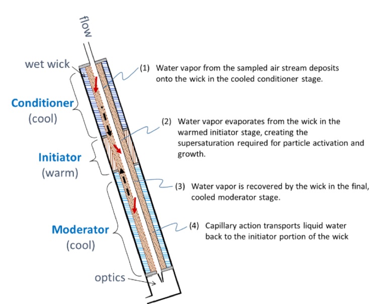 The acronym stands for moderated aerosol growth with internal water cycling. Ultrafine particles are enlarged by water condensation to form micrometer-sized droplets that are detected optically. MAGIC’s unique feature is to capture the water vapor needed for supersaturation internally, eliminating the need for internal water reservoirs.