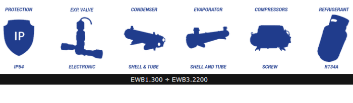 Standard Configuration:. Compressors: Screw. Condenser: Shell & Tube (EWB models only). Evaporator: Shell & Tube. Expansion Valve: Electronic. Protection Rating: IP54. Refrigerant: R134a; R513A and R1234ze. Cooling Capacity Range 291kW ÷ 2240kW,
