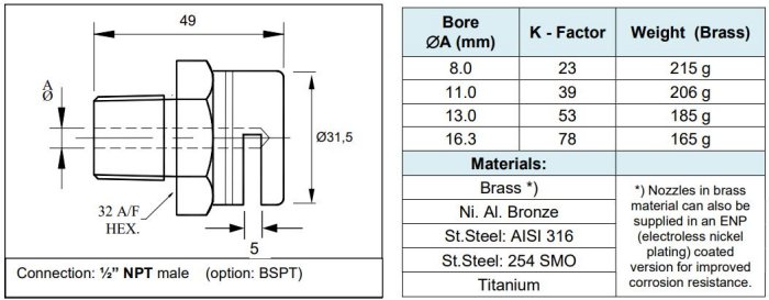 Nozzles should be selected to provide the required application rate for the hazard/application. Whilst the cooling / protective effect of the water curtain is difficult to quantify – a thumb rule is that small orifices operated at high pressure will generate small droplets (water mist) with little mass and velocity and limited spray robustness (is easily diverted by wind). The most robust spray is achieved by using nozzles with relatively large orifices, operated at low to medium pressure (recommended working pressure: 2 to 5 barg). It is recommended to consult NFPA 15 chapter 6 and 7 for more guidance on nozzle selection and installation.
