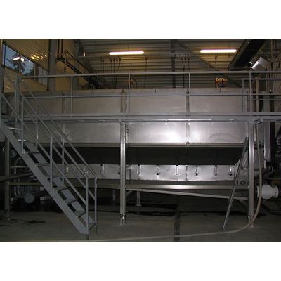 For gentle inload of root crops in production lines, EKKO Maskiner A/S has developed a water bunker with “Jacuzzi” bubble bath. The stainless tank contains 34 m³. Apart from pumping 150 m³ water through the tank per hour, we at the same time blow huge amounts of air in through 3 mm holes at the bottom.