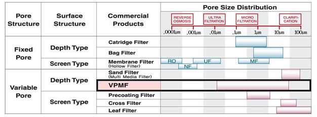BMFF-VPMF has principal like that micro fiber bundle is compressed by inlet flow pressure and become temporary filter layer. After capturing SS (Suspended Solid) particles for suitable term , this temporary filter layer is disassembled by backwash water to be fed in reverse direction for the filtration. That is BMFF-VPMF execute depth filtration to be accomplished by folding of micro fiber and is backwashed in the state of disassembled filter layer by flow of backwash