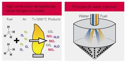 At over 1.200 °C, combustion changes the nitrogen in the air into dangerous nitrogen oxides (NOx). At a lower combustion temperature, NOx is reduced. Water is injected to cool things down. Water injection is usually mechanically controlled, but not electronically regulated. The only way to regulate the rate is by measuring the flow.
