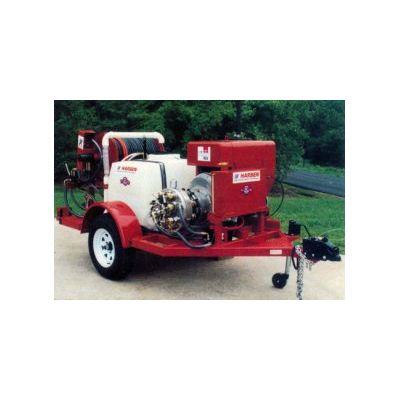 Harben`s 6 -22 or 8 -22 `P` Series Radial Piston Diaphragm Pump Producing up to 4,000 psi; up to 12 gpm or 16 gpm - 110 Gallon polyethylene water tank - Hydraulic hose reel with capacity for 500 ft. of 1/2" lightweight hose - Electric brakes and 2-5/16" ball hitch - Drain and sewer cleaning package.