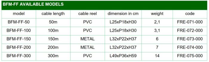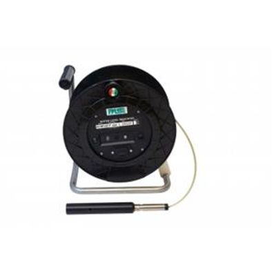 Water level indicator with removable downhole indicator; flat cable, stainless steel tape with 2 copper wires, coated with transparent antiscratch protective film in transparent LLDPE. Black millimeter graduation over total length, centimeter and decimeter indication in black, meter indication in red. Graduation: 1mm Probe diameter: 25mm (15 mm without downhole indicator), made of stainless steel and plastic. Water level indication by both acoustic signal and RED LED. GREEN LED indicates bottom reached. External screw for sensibility regulation. Powered by 1x9V battery, easy to be substituted (external drawer). Cable lenghts from 50m to 300m. Optional removable hook for bailer.