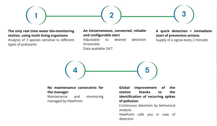A continuous flow of water, previously treated by the sewage treatment plant, is diverted to feed a ToxMate conditioning module, before coming into contact with the biological organisms. Monitoring is carried out in real time, 24 hours a day.