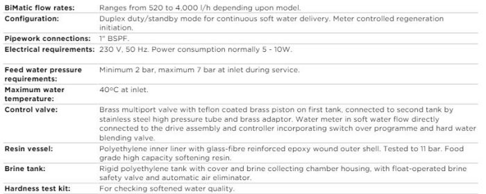 Bimatic water softeners are a range of high quality industrial units that utilise a brass multiport control valve to efficiently produce soft water for any industrial or process application. The integrated water meter and regeneration controller ensures the availability of softened water at all times due to the duty/standby mode of operation. Bimatic water softeners are , durable and require low maintenance.