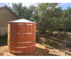 These tanks are built in our warehouse and shipped direct to the project site. TinyTimber Tanks do not require a concrete foundation and each comes standard with a 25-degree standing seam roof with mosquito-resistant screen, an overflow flange, hose spigot, and NSF-61 certified liner.