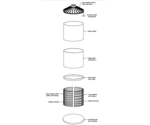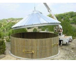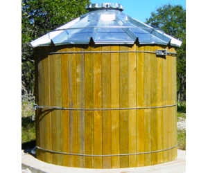 TimberTanks are water storage tanks that combine the ageless beauty of wood with the durability of galvanized steel roofs and the modern technology of flexible membrane liners for water containment. Wood staves are custom milled to form a barrel shape and are banded together with galvanized steel bands to retain the circular shape. The galvanized steel roof incorporates factory formed and punched high rib roof panels which create a durable and weatherproof roof structure.