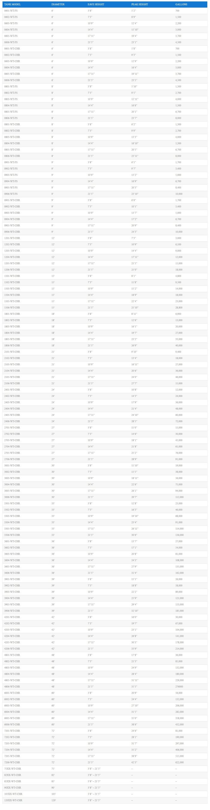 The most common CorGal tanks in use are the tanks with 30-degree roofs. This standard tank consists of corrugated galvanized steel wall sheets with a 30-degree galvanized steel roof system. The standard 30-degree roof tanks are equipped with a geotextile preliner and a flexible membrane main liner for water containment. The corrugated high-rib roof (CHR) design is standard on all models 12′ diameter and larger. The 6′, 8′, and 9′ diameter models have a flat-seam (FS) roof as standard but the corrugated high-rib roof is available as an option. The 30-degree roof tanks are pre-engineered for water storage in a seismic zone 2B with a 90 MPH wind speed at a UBC Exposure C location. Roof snow load ratings are available for specific locations.