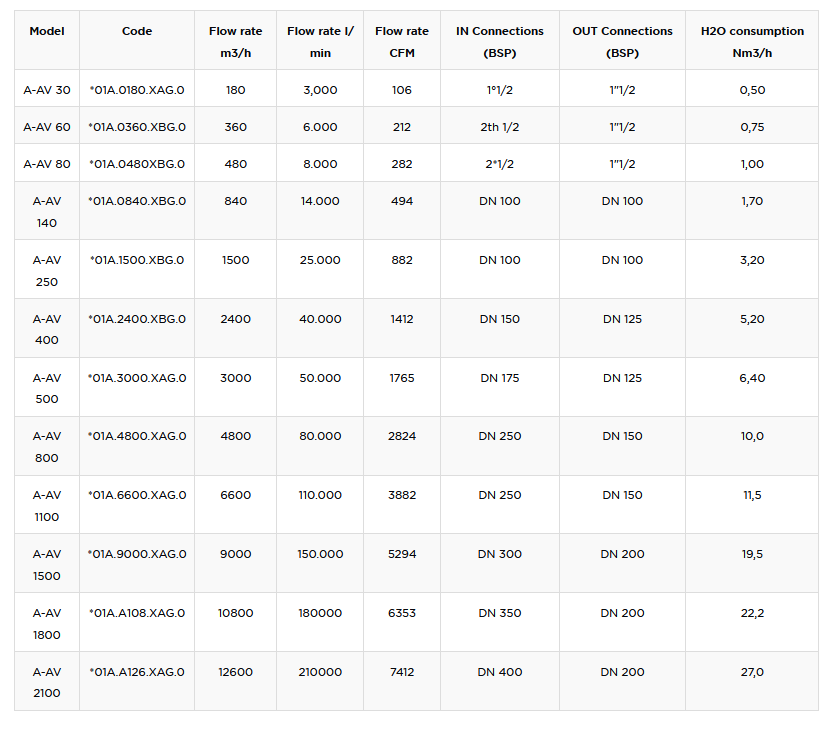 Extension of the working range - The maximum air inlet temperature has been increased to +200°C, for all models from A-AV140 to A-AV2100.