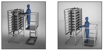 In order to improve the ergonometrics and simplify the handling, AM have developed a work lift adapted to CompHatch. The hatching units may be placed on a base, 30 or 50 cm above the floor level to make it easier to serve the lowest shelves from the floor, at the same time for easy access to the upper shelves by using the lift.