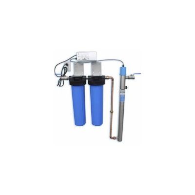 This UV System comes equipped with dual pre-filtration. The water first enters the sediment filter housing, where a sediment filter cartridge (made from melt-blown Polypropylene) removes dirt, rust and other sediments down to 5 micron (cartridge Part # 14-WFS20BB-5SP). This is followed by a second filter housing with a carbon block filter cartridge at 10 micron (made from Coconut Shell Carbon), which removes chlorine, taste and odour from the water (cartridge Part # 14- FC20BB5CB). The filter cartridges are NSF certified and have an excellent chemical resistance in all food and beverage purification applications and a low pressure drop. Additional filtration stages can be installed, such as a self-cleaning Spin Down Separator that keeps the filter cartridges from clogging up if elevated sediment levels are present (Part # 13-SDF-2).