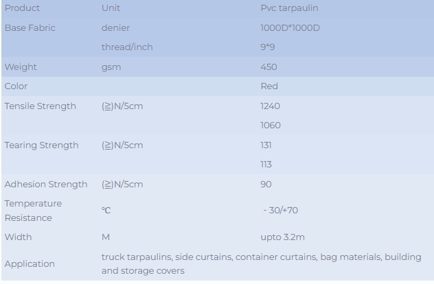 Tent material is ideal for protective covering applications. Upto 3.20m wide, the excellent weldability (high-frequency, hot air,etc), high tear-resistance, flame retardant (upon request) and resistance to ageing provides the material a long life time.
