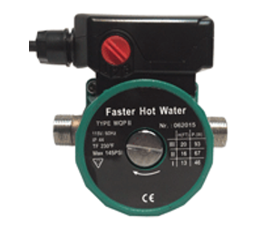 A small, high speed, ultra-quiet hot water circulation pump is installed on the hot water outlet of a tank or tankless water heater.