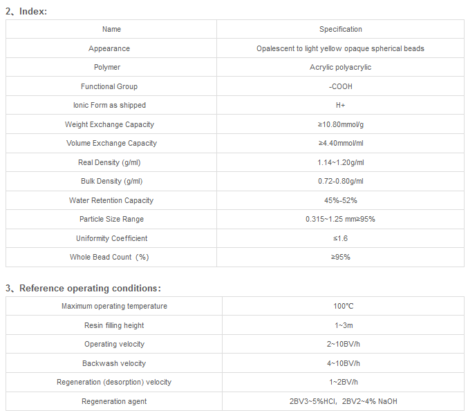 D113 resin is in a carboxylic acid on the pore structure of acrylic copolymer (-cooh) group - cation exchange resin.Mainly used in industrial water treatment, especially the removal of bicarbonate, carbonate and other alkaline salt, also can be used for zinc, nickel waste recycling, separation and purification of biochemical drugs, etc.