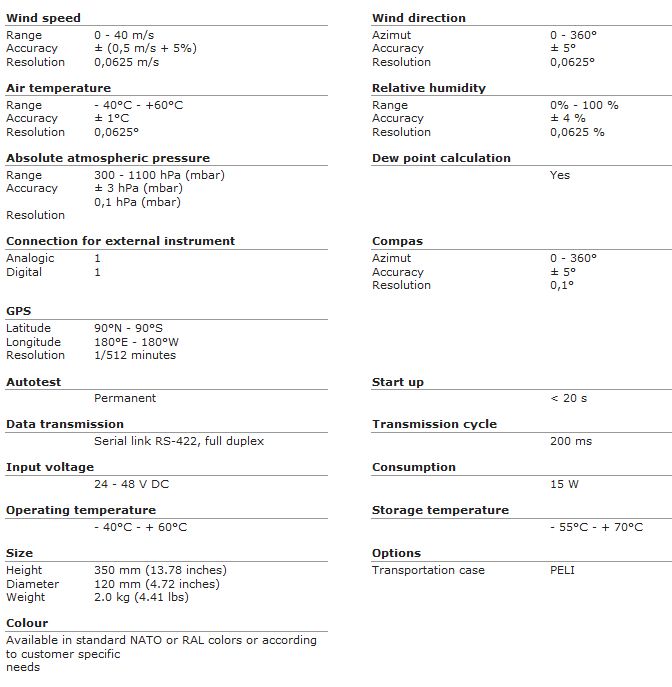 The high precision weather sensor WST6000CGPS answers quickly the variations of wind and measures from the slightest breath. The measurements provided by the weather sensor are transmitted by a RS-422 serial link. This instrument supports without problem shocks and vibrations. It does not requiring any particular maintenance. It is robust, compact, automatic and without any moving parts.