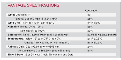 Includes Vantage Pro2 console/receiver, integrated sensor suite, and mounting hardware. Integrated sensor suite includes rain collector, temperature and humidity sensors, anemometer, 40` (12 m) anemometer cable, and solar panel. Electronic components are housed in a weather-resistant shelter. For improved accuracy, temperature and humidity sensors are housed inside a radiation shield