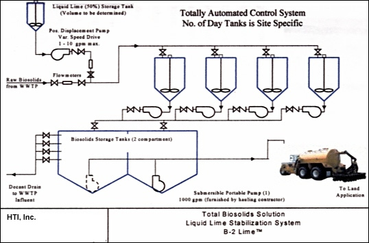 This unique and automated system feeds the correct amount of liquid lime (CACO calcium oxide) to any type of liquid biosolids for achieving EPA 503 Class “B” stabilization results. This system can be adapted almost any type of WWTP for the stabilization of biosolids. This system provides a very simple method to achieve Class “B” stabilization and at the same time will enhance the settleability of the biosolids once it is put into storage. In one particular user’s case, the cost of the liquid lime to treat the biosolids was approximately $0.0025/gallon. Previously they had been hauling solids of less than 1.5%, now they are averaging over 8.0% to land application.